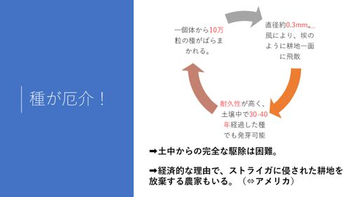 こんにちは!だーけんです! 今回は “ ストライガ ” の 被害、原因、対策 について発表しました。 ストライガは ハマウツボ科ストライガ属に分類される一年生の半寄生植物 です 種によって宿主植物は異なりますが、今回はトウモロコシやソルガムといったイネ…